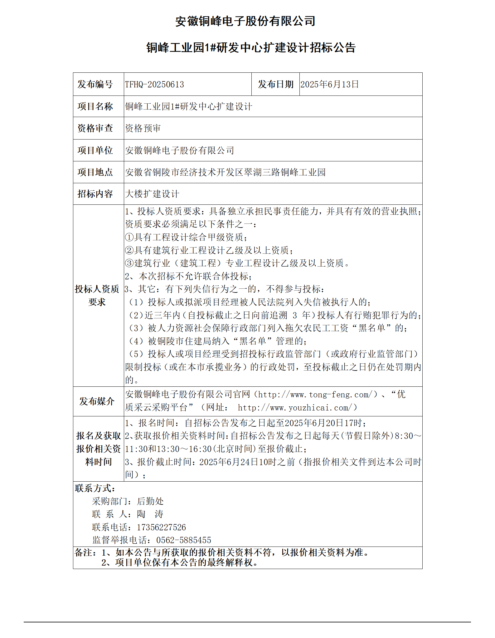 安徽銅峰電子股份有限公司 (銅峰工業(yè)園1#研發(fā)中心擴建設(shè)計招標公告)_01